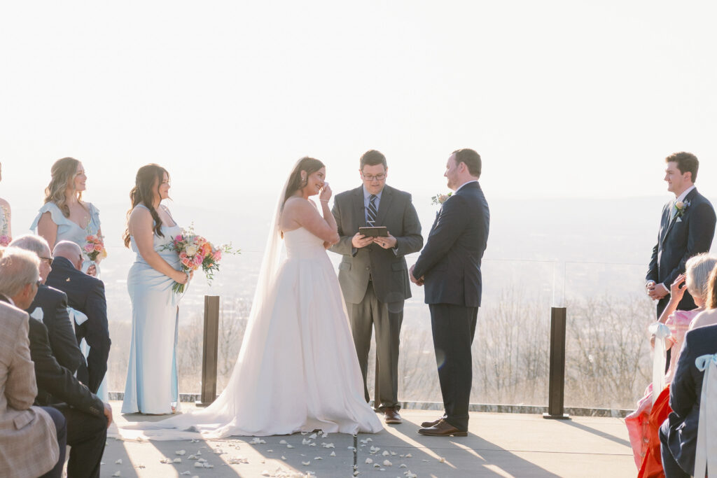 Set against the panoramic backdrop of the mountain, their ceremony felt intimate despite the expansive view. As Caroline walked down the aisle, time seemed to pause. The soft glow of late afternoon light wrapped around them, creating a moment that felt both cinematic and deeply real.